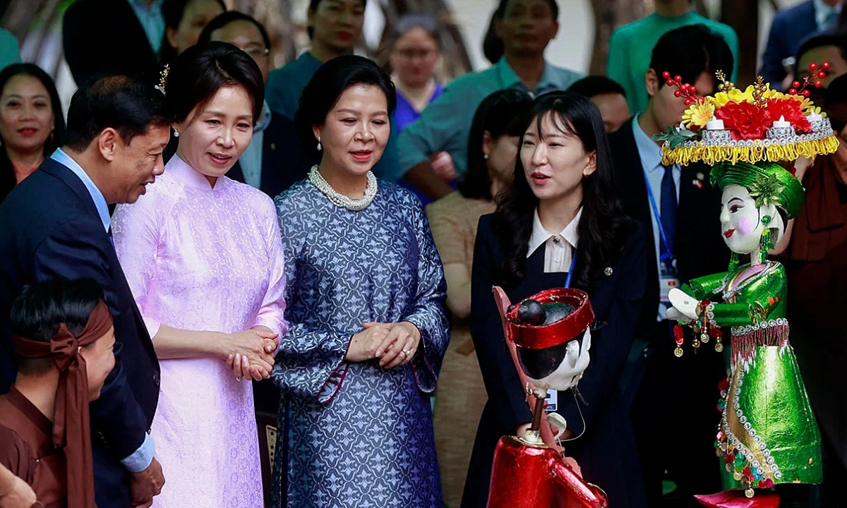| Phu nhân Tổng thống Hàn Quốc xem múa rối nước, làm bánh tại Hà Nội | |