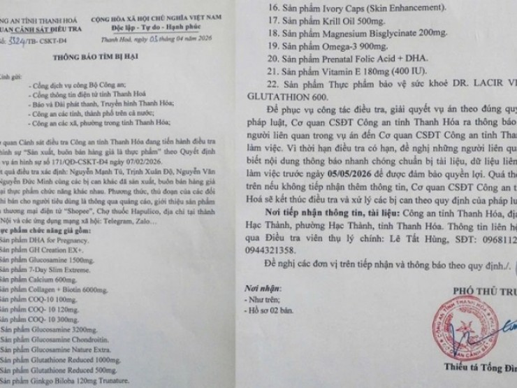 | Để phục vụ công tác điều tra vụ án sản xuất, buôn bán 22 loại thực phẩm chức năng giả, Công an tỉnh Thanh Hóa đã phát đi thông báo tìm bị hại...Xem tiếp>>> | |
