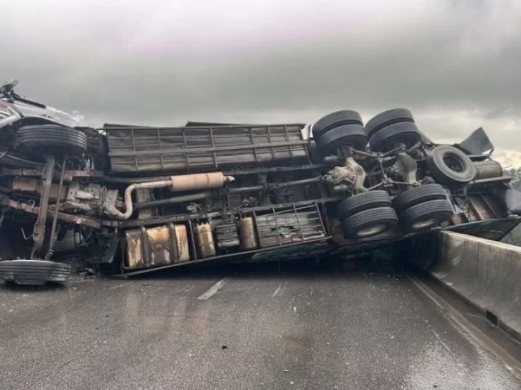 | Xe tải lật chắn ngang cầu vượt trên cao tốc, giao thông tắc nghẽn | |